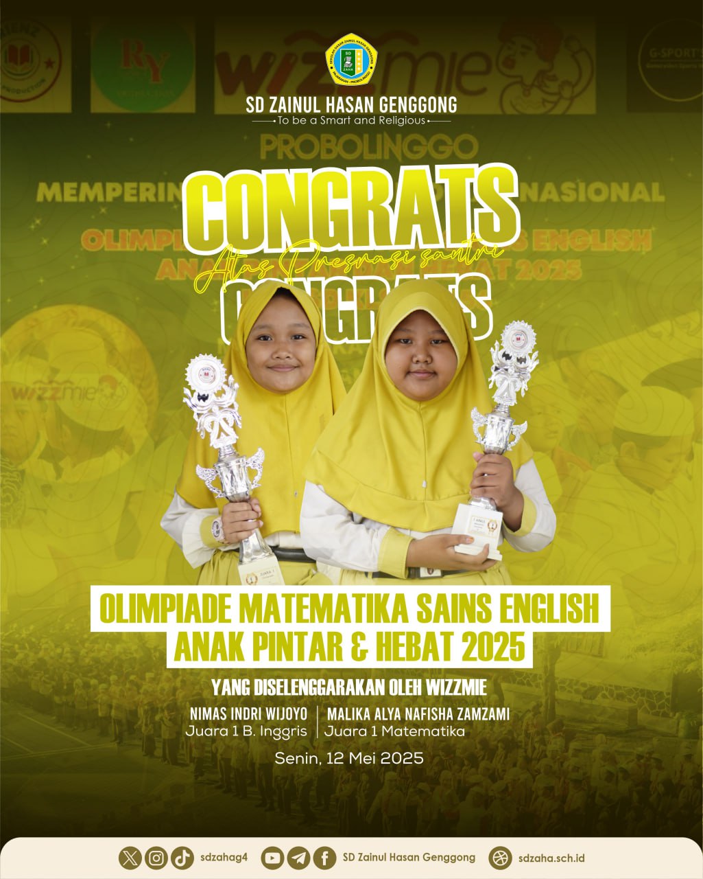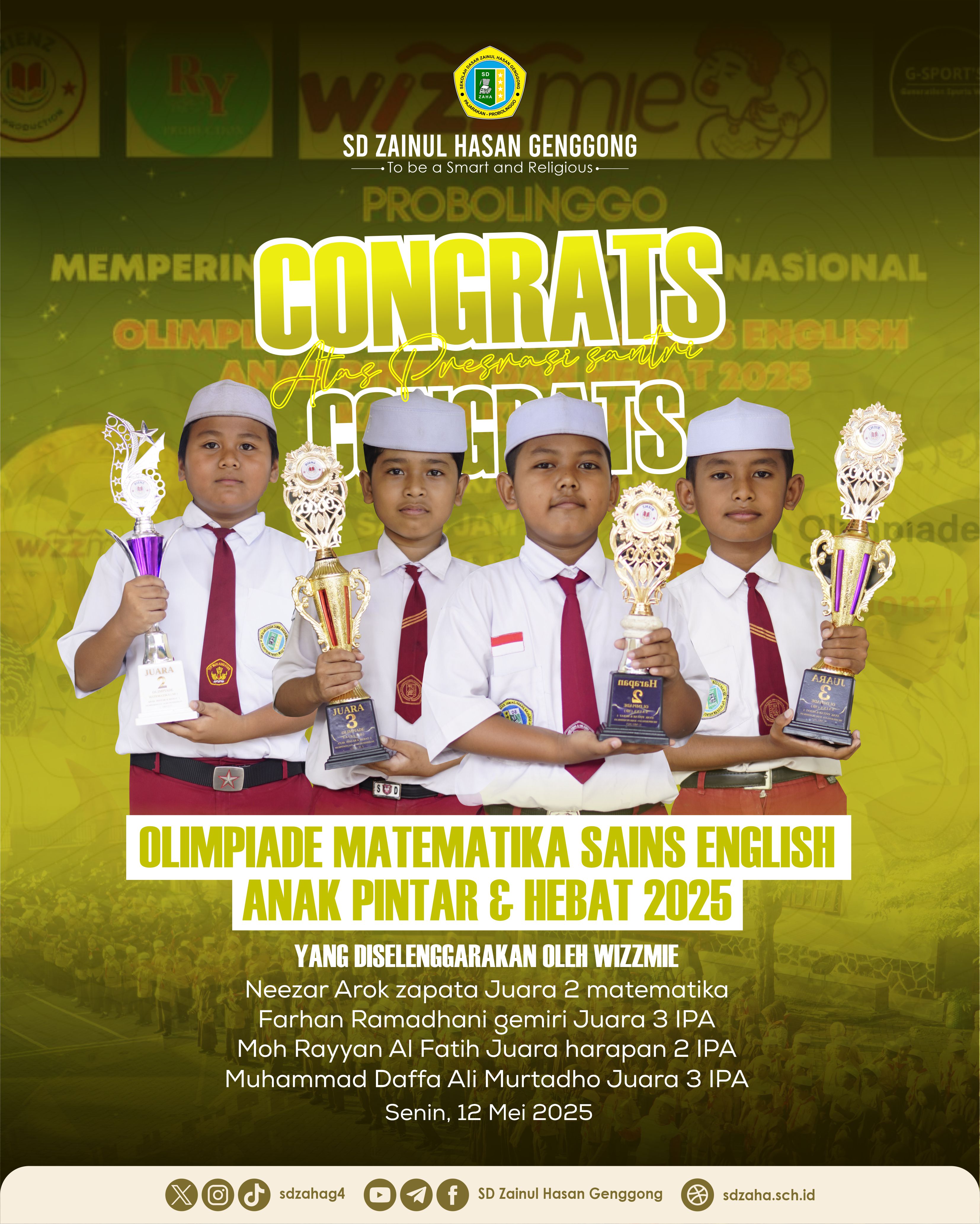 Genggong – 14 Mei 2025 Santri SD Zaha kembali mengukir prestasi membanggakan dalam ajang lomba akademik yang diselenggarakan oleh WIZZMIE Kabupaten Probolinggo. Dalam kompetisi yang diikuti oleh berbagai sekolah dasar ini, santri SD Zaha menunjukkan kemampuan terbaik mereka di bidang Matematika dan Ilmu Pengetahuan Alam (IPA).